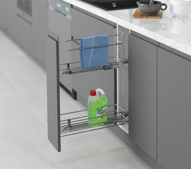 CARGO 20 to kosz przeznaczony do przechowywania ręczników kuchennych, folii, papieru do pieczenia i innych niezbędnych akcesoriów. Prawy wysuw umożliwia intuicyjne i wygodne wysunięcie całego kosza, dzięki czemu dostęp do wszystkich produktów jest szybki i komfortowy. Specjalnie zaprojektowane przegrody i uchwyty utrzymują produkty w miejscu i zapobiegają ich przesuwaniu się podczas otwierania i zamykania szafki, co zwiększa porządek i wygodę użytkowania.