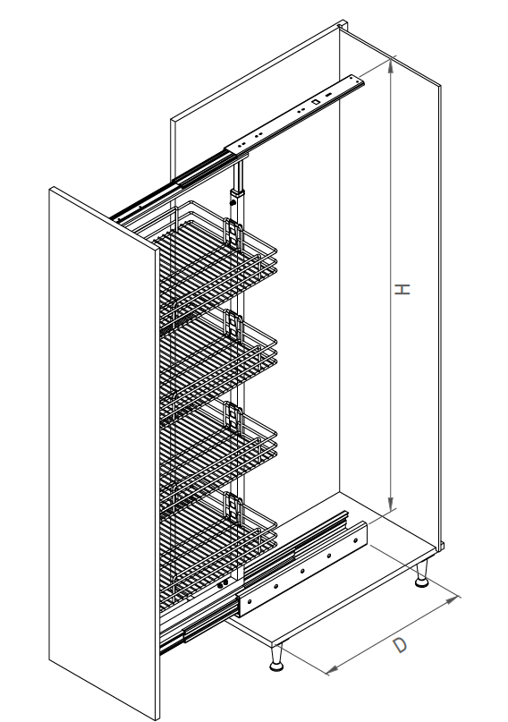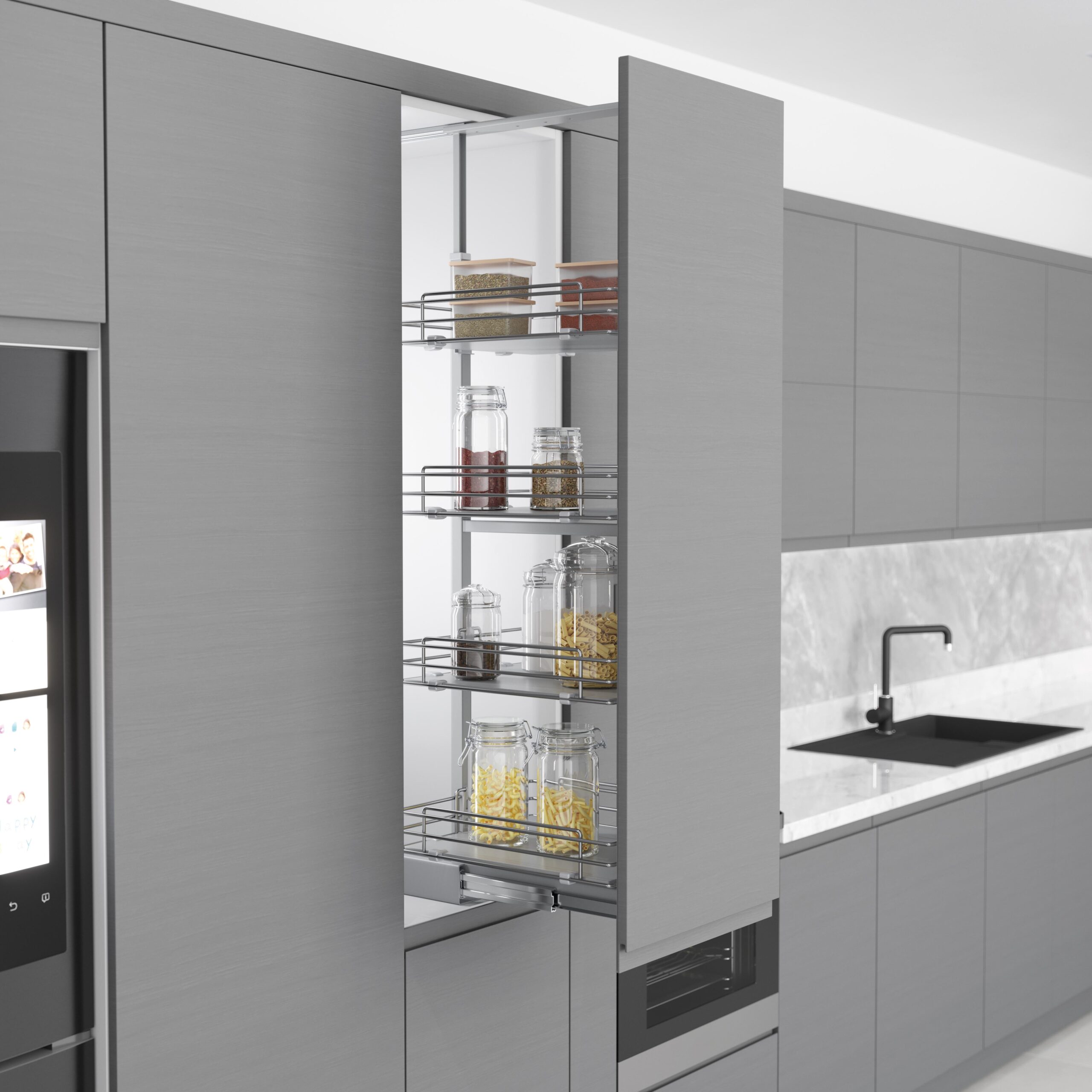 Model S-1813-A to eleganckie i praktyczne cargo wysokie w kolorze antracyt, wyposażone w system cichego domyku. Zapewnia płynne i bezgłośne działanie, a jego solidna konstrukcja umożliwia wygodne przechowywanie żywności lub akcesoriów kuchennych. Idealne rozwiązanie do nowoczesnych zabudów, gwarantujące porządek i funkcjonalność.