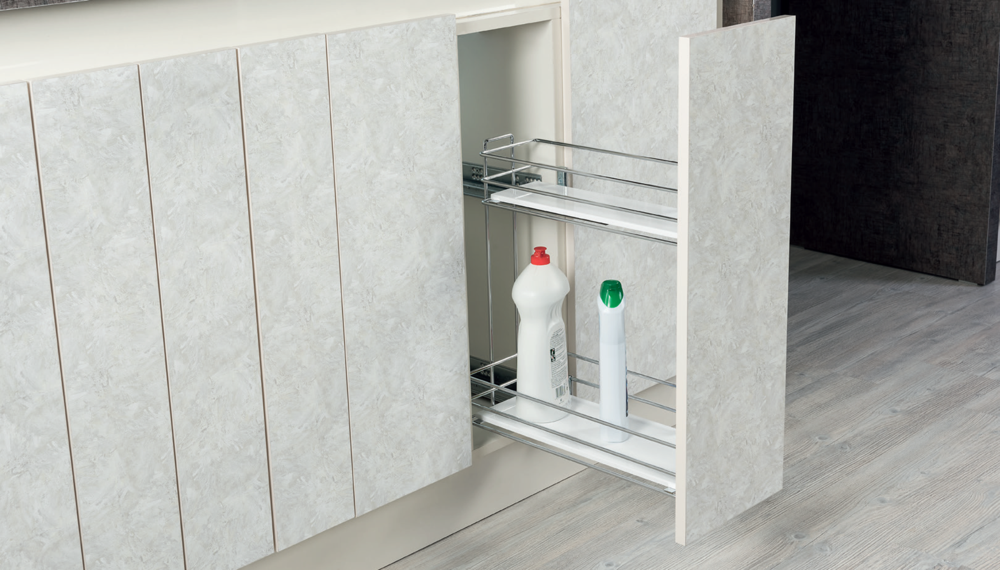 CARGO boczne 20 II zostało zaprojektowane z myślą o montażu po prawej stronie szafki o szerokości 200 mm. Jest to idealne rozwiązanie do zagospodarowania wąskich przestrzeni, które w tradycyjnych szafkach często pozostają niewykorzystane. System umożliwia wygodne przechowywanie butelek, przypraw, detergentów, pojemników kuchennych oraz innych akcesoriów codziennego użytku. Stabilne przegrody i solidne ścianki boczne zapobiegają przesuwaniu się produktów podczas wysuwania kosza, co zwiększa komfort użytkowania i porządek w kuchni.
