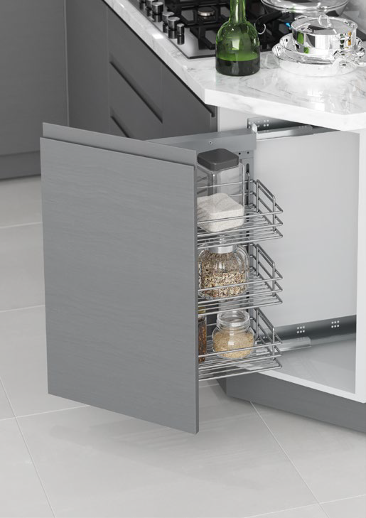 Cargo boczne 30 III PRA.TAND.PW.DOMYK BL 60’ CHROM to praktyczne i eleganckie rozwiązanie do każdej kuchni. Wyposażone w trzy poziomy półek i mechanizm pełnego wysuwu z domykiem (Tandem), zapewnia wygodny i bezpieczny dostęp do przechowywanych produktów. Solidna konstrukcja oraz chromowane wykończenie gwarantują trwałość i estetyczny wygląd przez wiele lat. Cargo boczne optymalizuje wąskie przestrzenie w szafkach, umożliwiając uporządkowane przechowywanie butelek, słoików i innych akcesoriów kuchennych. Idealne do nowoczesnych kuchni, łącząc funkcjonalność z eleganckim designem.