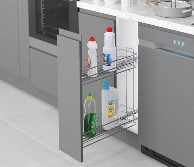 CARGO boczne 25 II zostało stworzone po to, by uczynić każdą szafkę wąską – w pełni funkcjonalną. Dzięki przemyślanej konstrukcji, system pozwala wygodnie zagospodarować nawet najmniejsze przestrzenie w zabudowie kuchennej, tworząc praktyczne miejsce na przyprawy, oleje, butelki, detergenty lub inne drobne akcesoria.