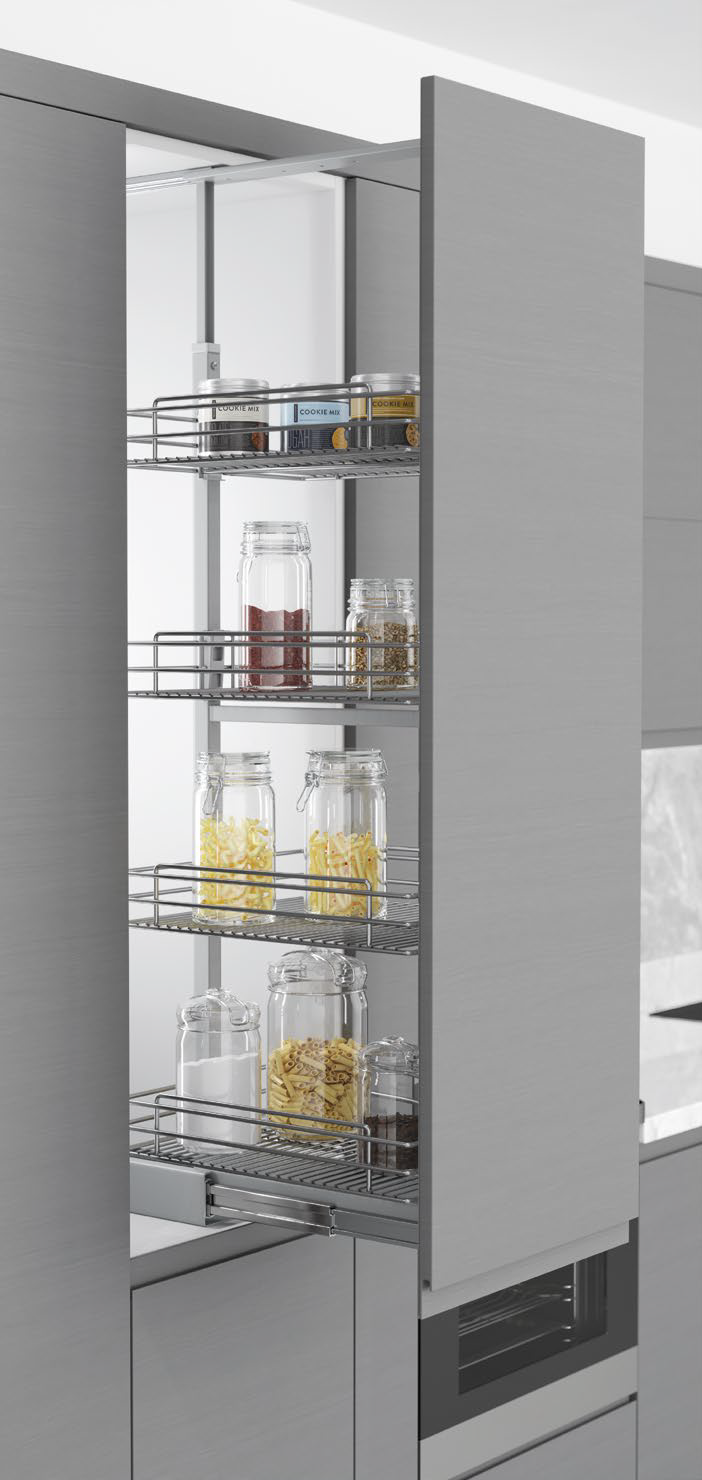 Cargo S-1815-C to wysoka, funkcjonalna szuflada z chromowanym wykończeniem, wyposażona w mechanizm cichego domyku. Umożliwia wygodne przechowywanie produktów w szafkach kuchennych, maksymalnie wykorzystując przestrzeń. Solidna konstrukcja zapewnia trwałość, a eleganckie wykończenie nadaje wnętrzu nowoczesny i estetyczny charakter.
