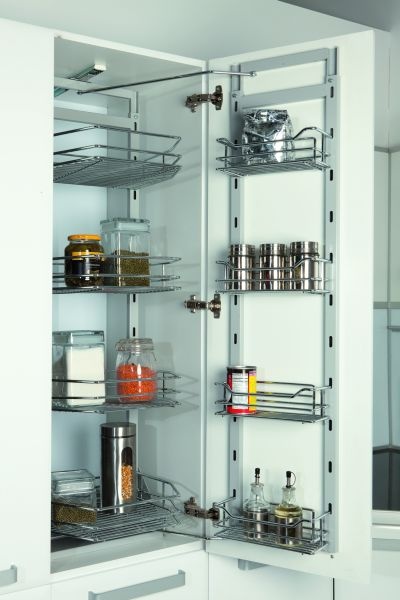 System cargo Starax z serii Twin Larder to praktyczne rozwiązanie do wysokich szafek kuchennych, pozwalające maksymalnie wykorzystać przestrzeń do przechowywania. Zestaw wyposażony jest w 5 solidnych półek z drucianym dnem w kolorze chrom, które zapewniają stabilne i wygodne przechowywanie produktów spożywczych i akcesoriów kuchennych.