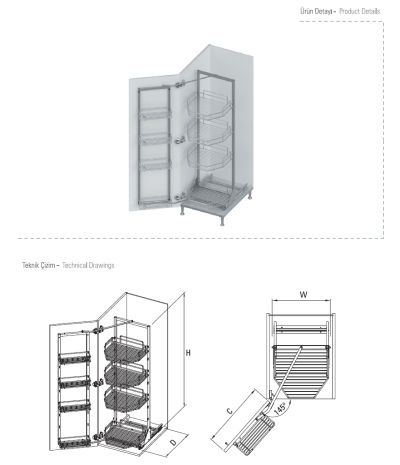 Mechanizm działa na zasadzie jednoczesnego wysuwania półek wewnętrznych i frontowych, co daje pełny dostęp do całej zawartości szafki. Dzięki regulowanej wysokości montażu można dopasować system do różnych wymiarów mebli.