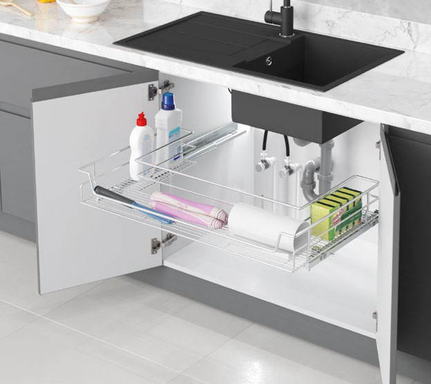 Szuflada S-2351-C to praktyczne rozwiązanie do kuchni, zaprojektowane pod zlew, umożliwiające wygodne przechowywanie akcesoriów kuchennych. Wyposażona w prowadnice BLUM z pełnym wysuwem TANDEM, zapewnia płynne, ciche i stabilne otwieranie oraz pełny dostęp do wnętrza. Solidna konstrukcja i przemyślany układ szuflady gwarantują wygodę użytkowania, łącząc funkcjonalność z nowoczesnym i eleganckim designem. Idealna do każdej współczesnej zabudowy kuchennej.
