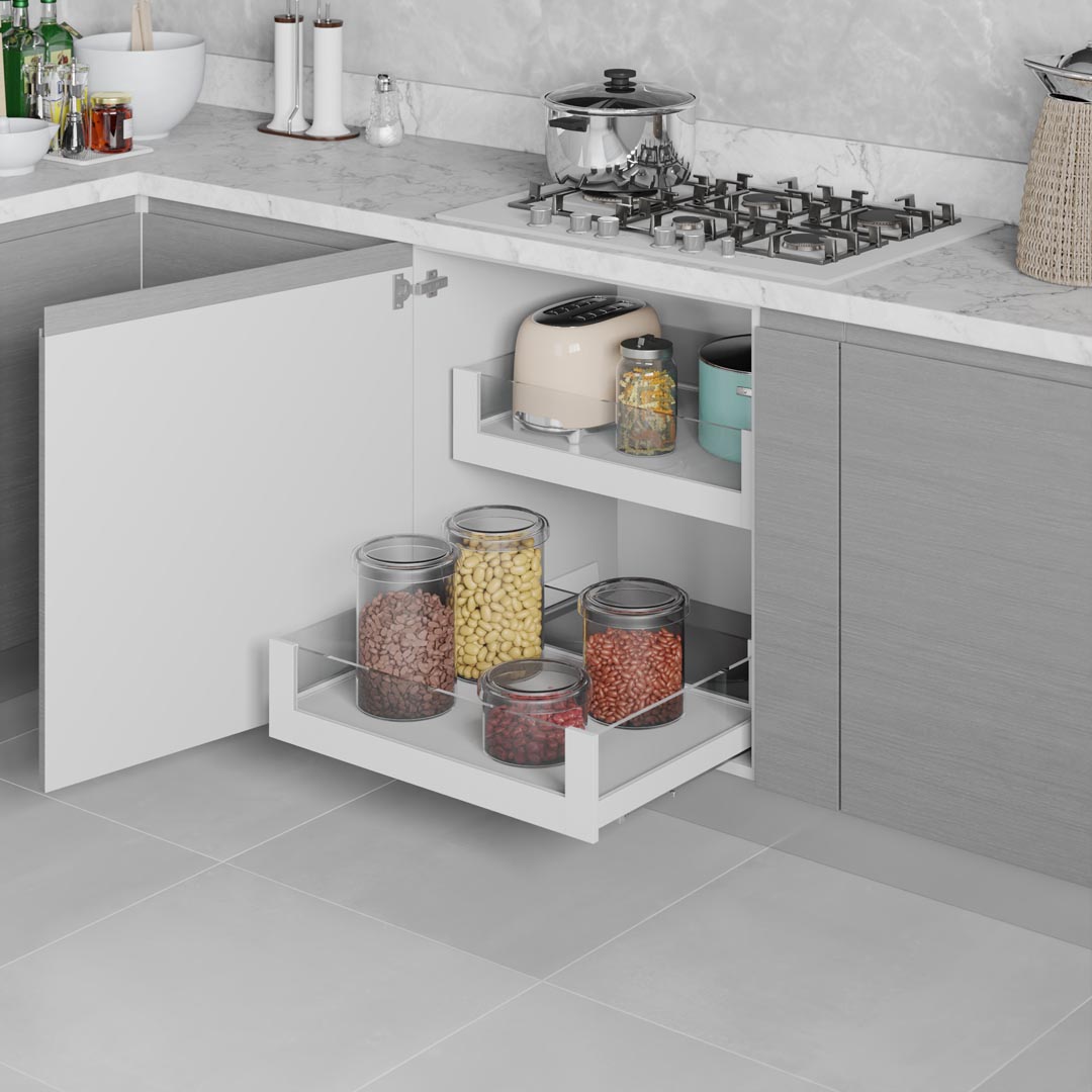 Szuflada S-2336-P-W z linii PREMIUM to nowoczesne i eleganckie rozwiązanie do zabudowy kuchennej. Posiada szklane boki, system prowadnic BLUM z pełnym wysuwem i cichym domykiem, a także białą matę antypoślizgową, która zapobiega przesuwaniu się zawartości. Doskonałe połączenie designu, funkcjonalności i komfortu użytkowania.