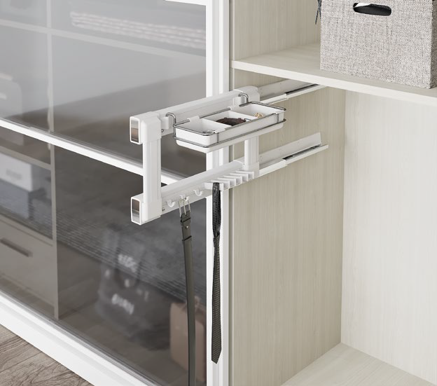 Wieszak boczny Starax S-6736-W to funkcjonalne rozwiązanie do szaf i garderób, przeznaczone do montażu po prawej stronie. Pozwala na uporządkowane przechowywanie pasków, krawatów i innych dodatków dzięki wbudowanemu systemowi organizacyjnemu. Wykonany z trwałych materiałów i wykończony w kolorze białym, gwarantuje estetyczny wygląd i wygodny dostęp do akcesoriów. Idealny do nowoczesnych szaf i przestronnych garderób, gdzie liczy się zarówno porządek, jak i styl.